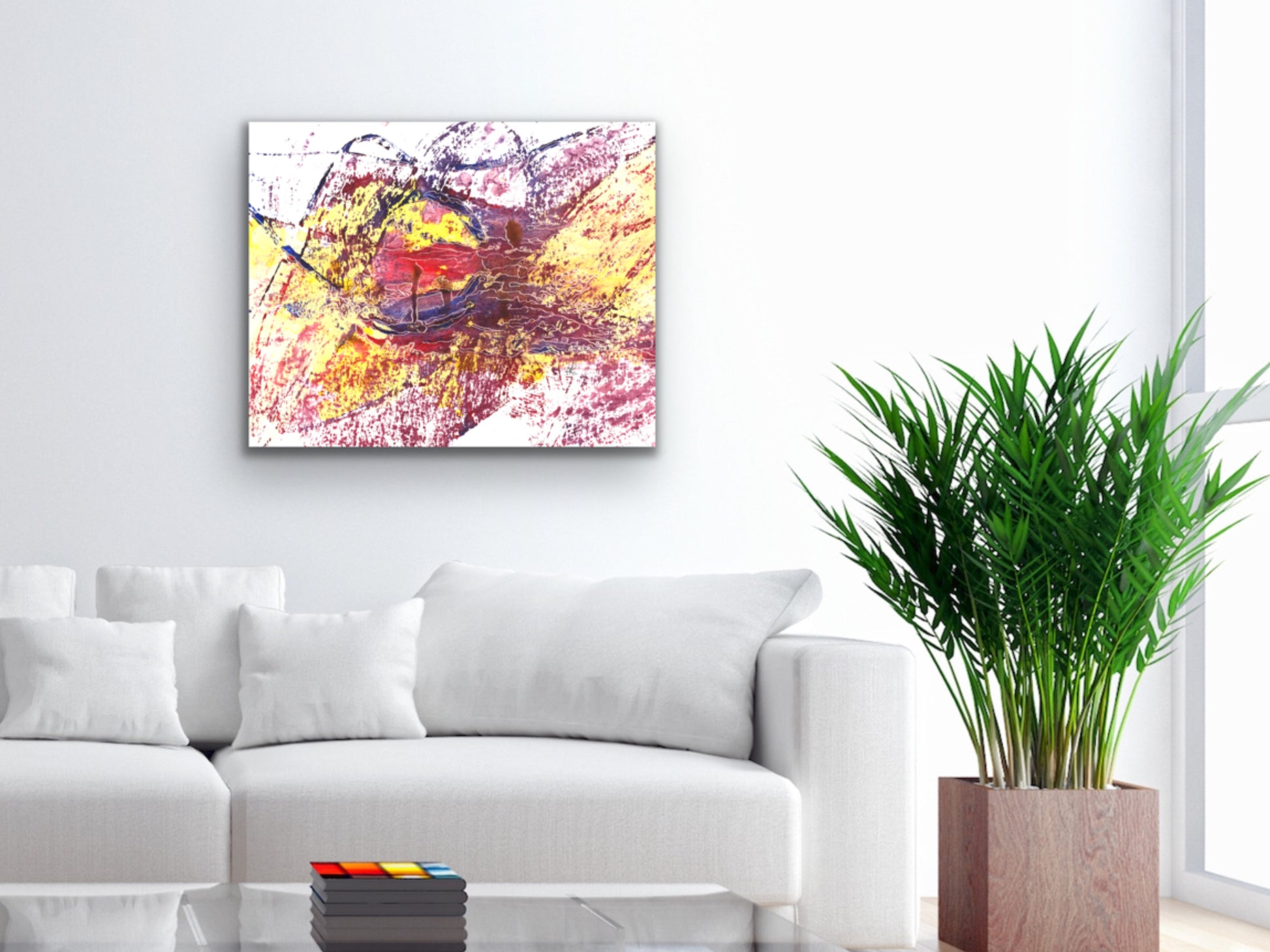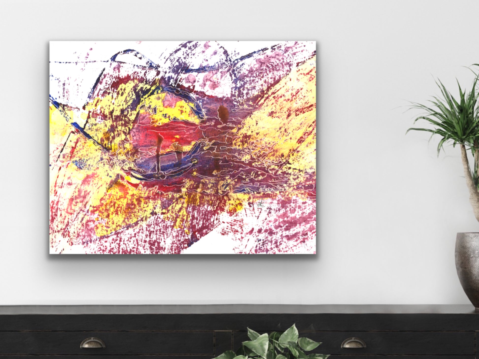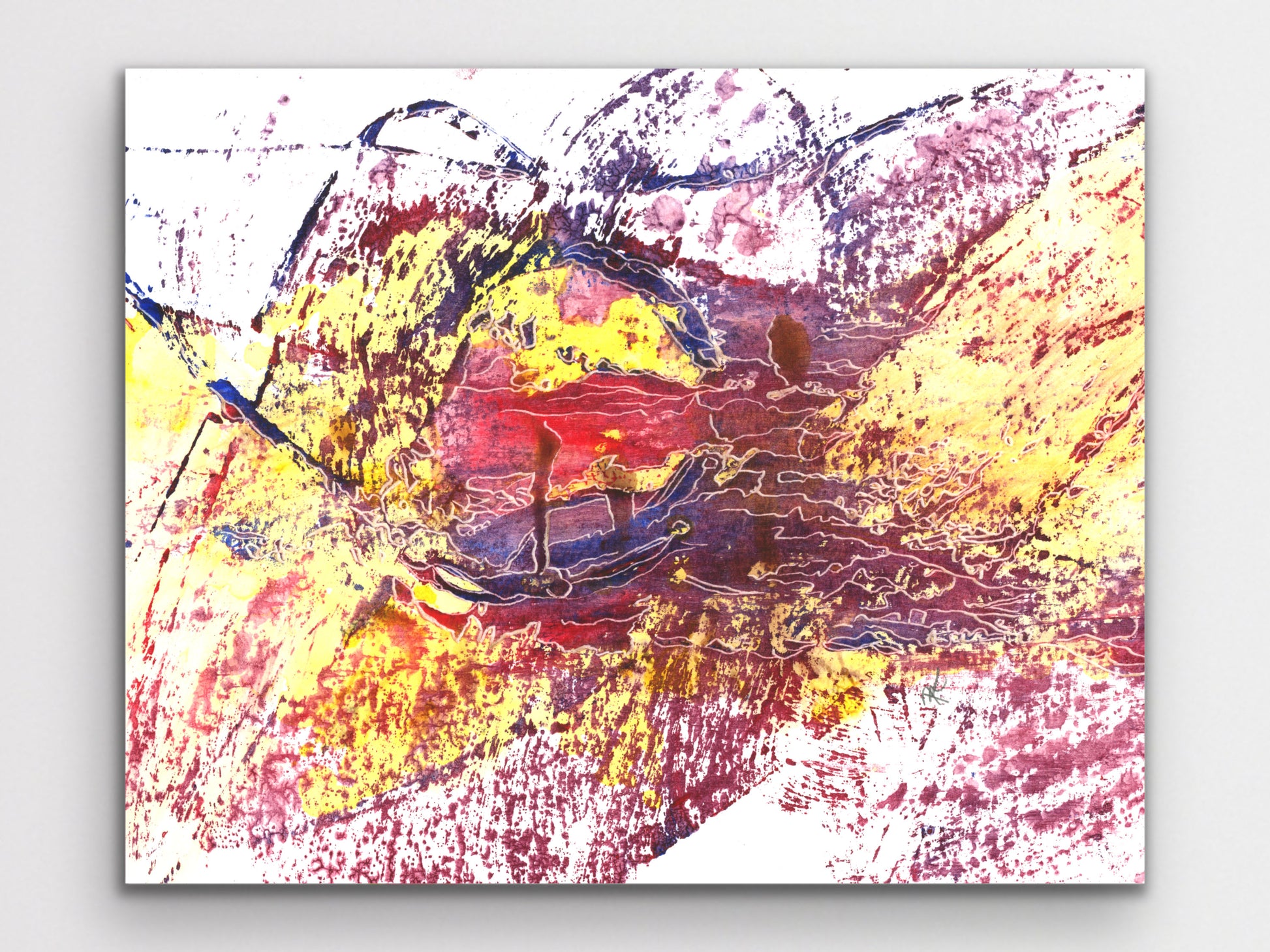 A red, yellow, and purple abstract acrylic and etch art print for your home. living room, study, den, dining room, kitchen, or office. A fine art print on archival matte paper.