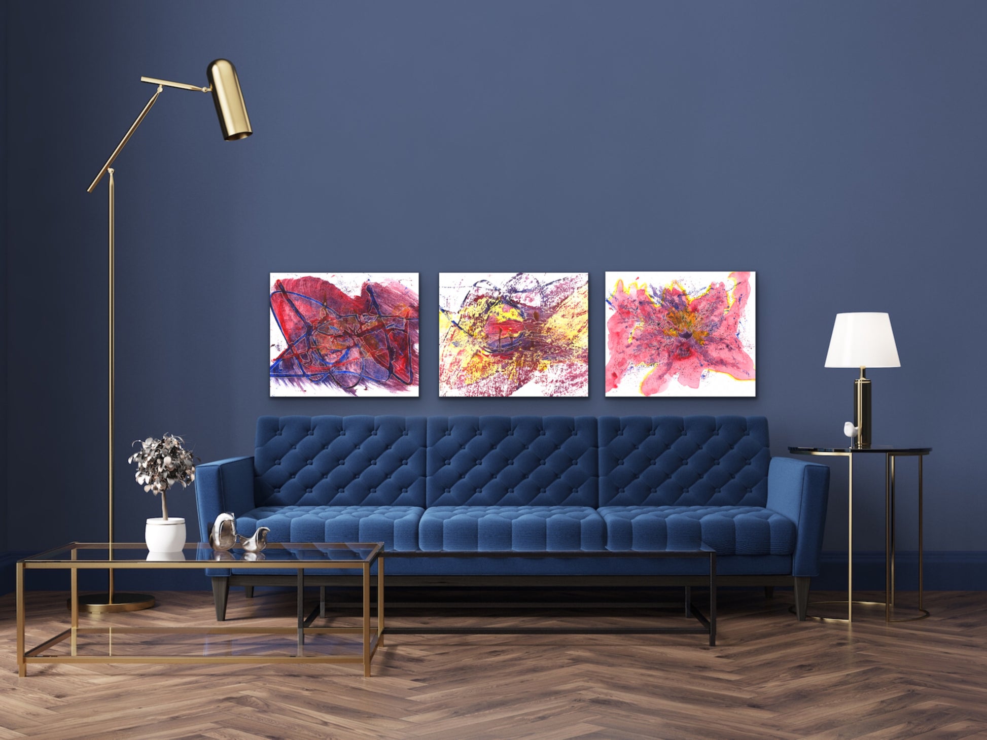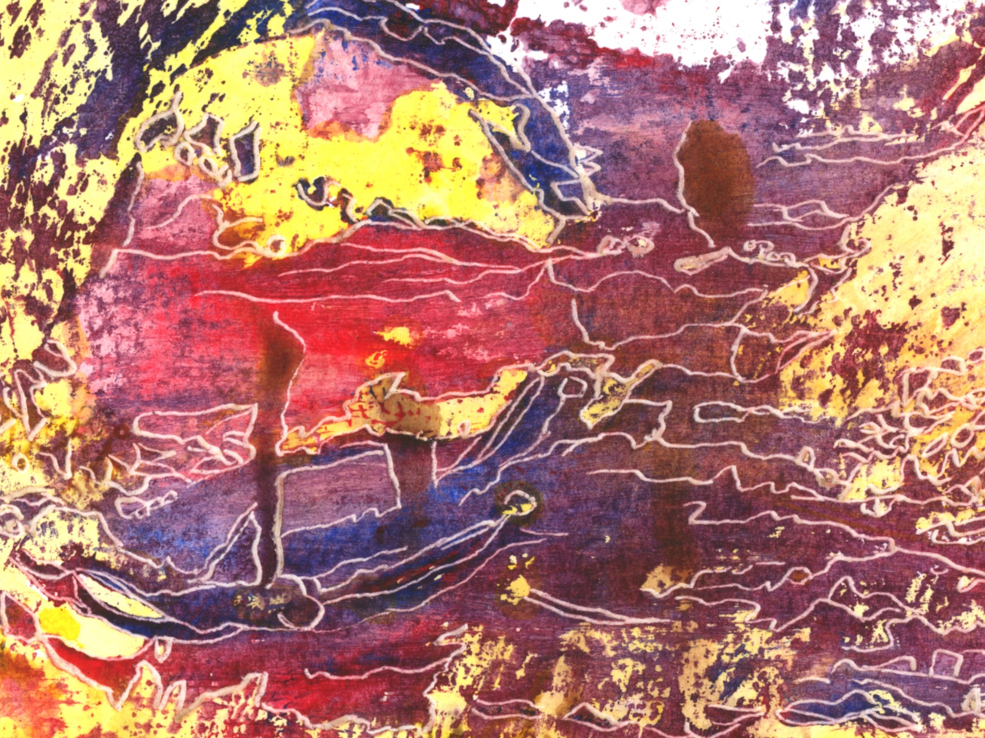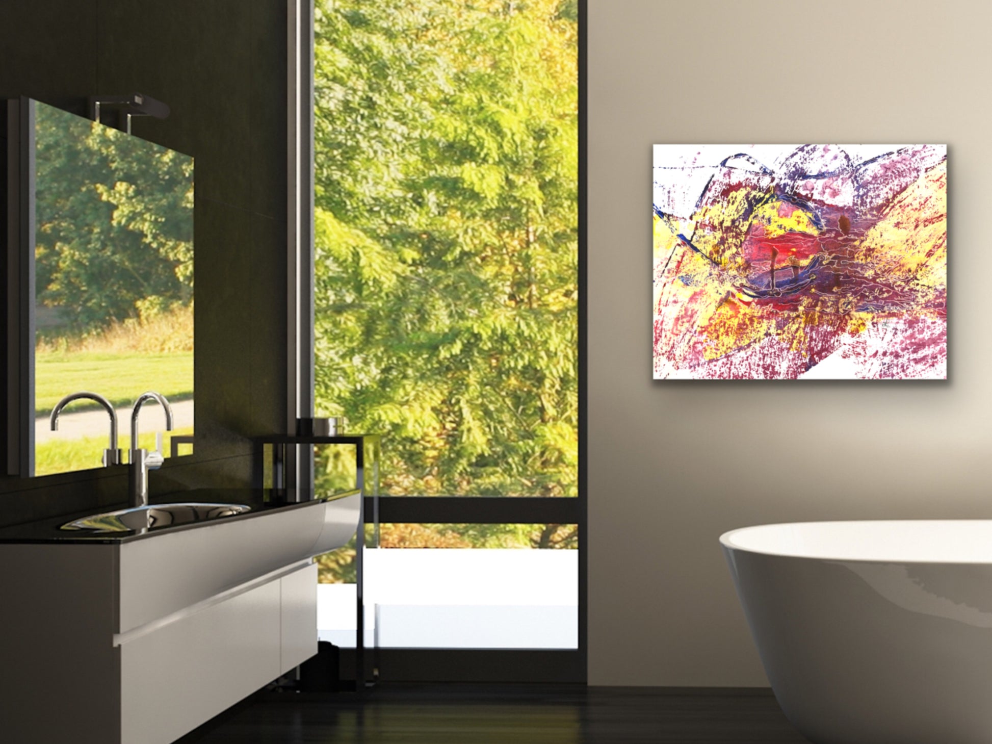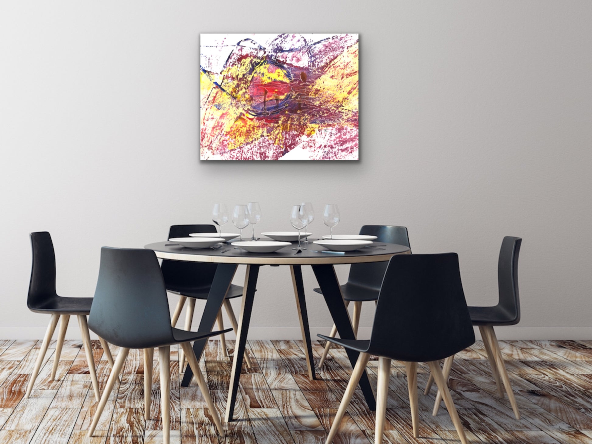 A red, yellow, and purple abstract acrylic and etch art print for your home. living room, study, den, dining room, kitchen, or office. A fine art print on archival matte paper.