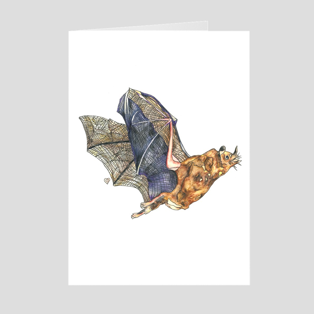 This Bat Greeting Card is blank inside ready to be inscribed and sent to your loved one. Images show front and back of the card. This high quality 5 x 7 paper card comes pre-folded, with a white envelope. Works well with regular ballpoint pens after a short drying time. Card is folded intentionally offset to allow a slight overhang so the cards can be easily opened. Current production time: Estimated production time approx. 6 days. Shipped USPS First Class PKG with tracking.Comes packed in cello sleeve and flat mailer. For personal use only. For commercial or licensing inquiries please contact me.