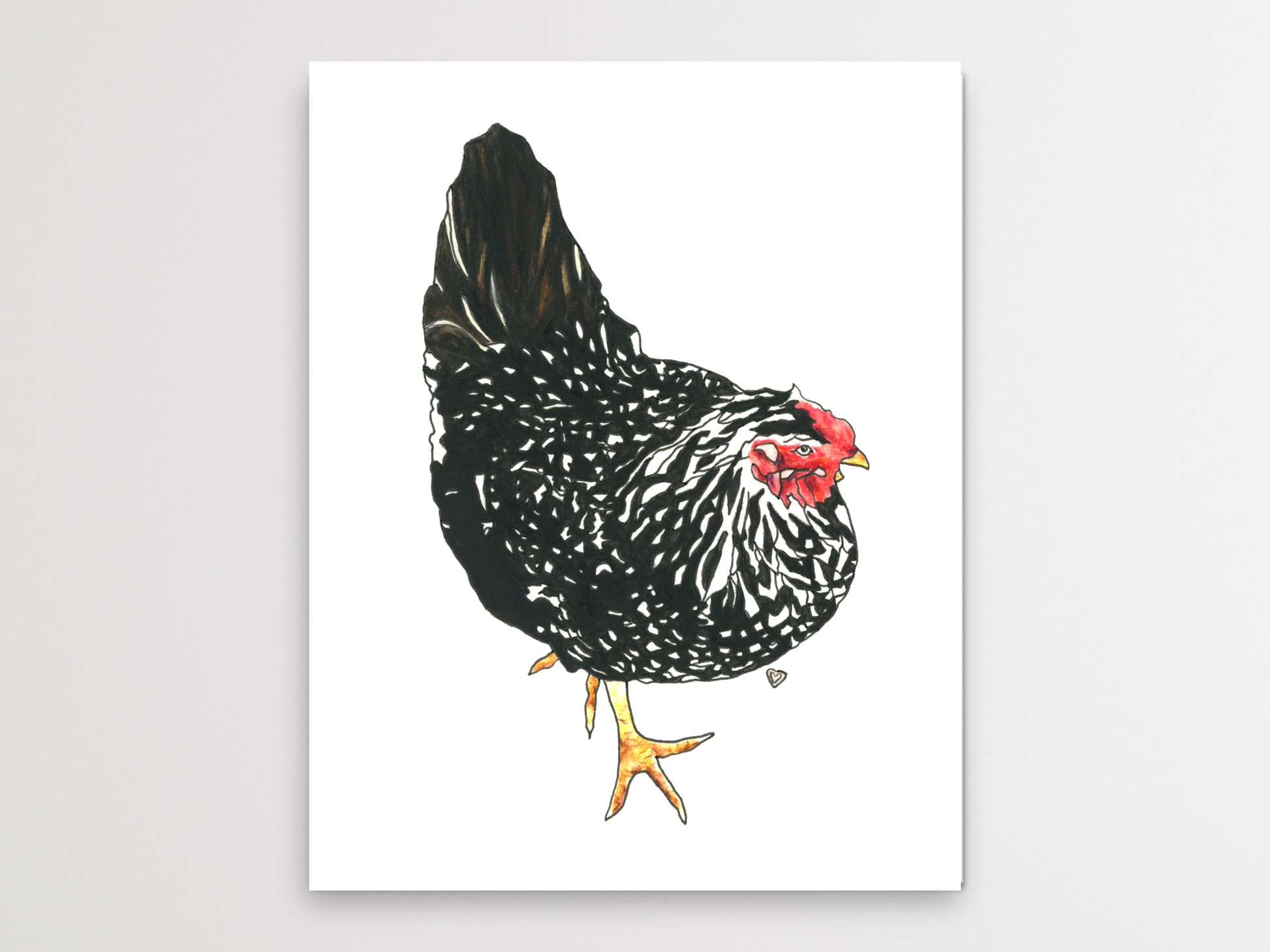 Black Chicken With White Spots Watercolor and Ink art print for your home, living room, den, study, kitchen, dining room, nursery, or office. A fine art print on archival matte paper.
