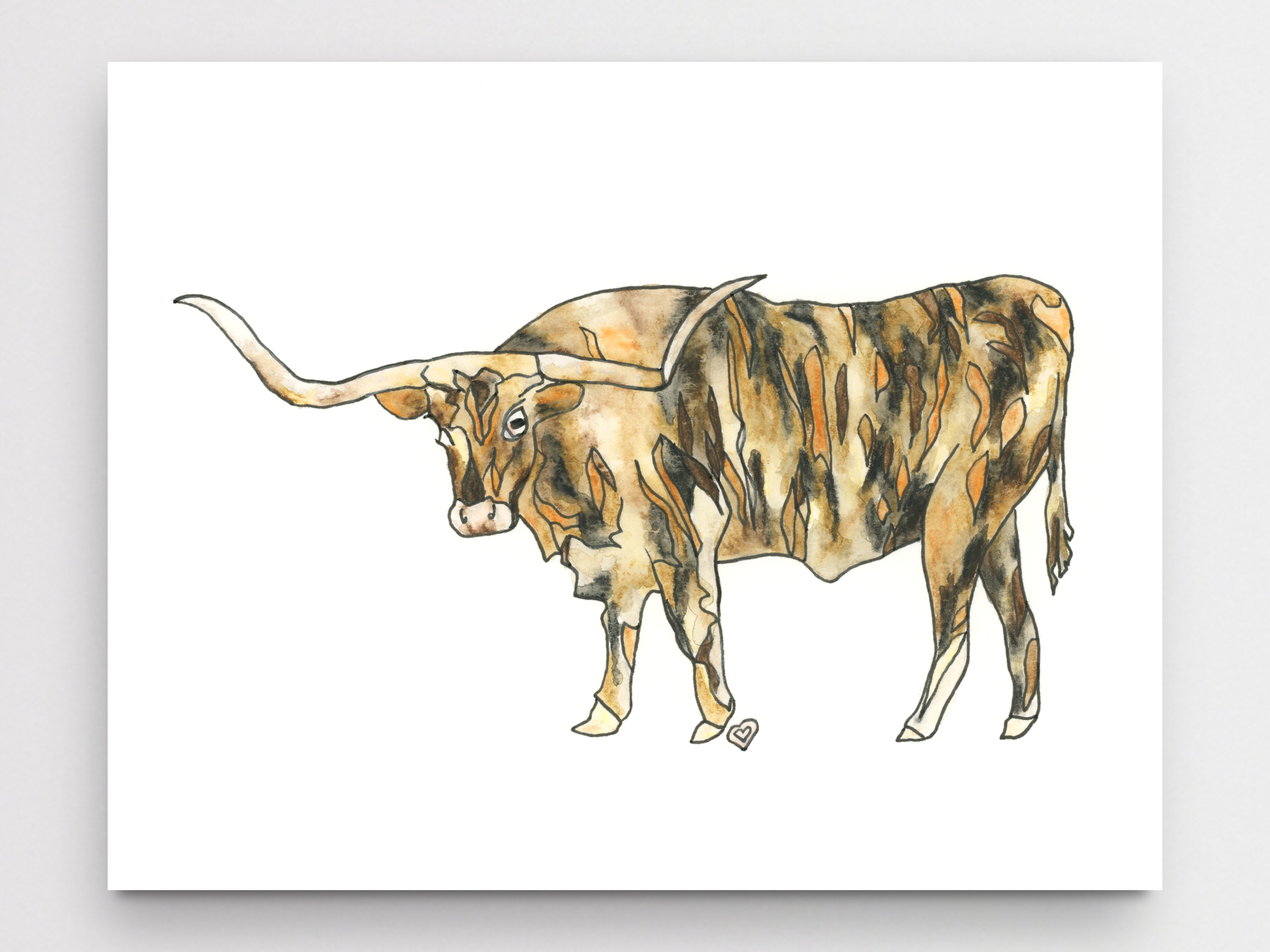 A watercolor and ink Longhorn art print for your home, living room, den, study, kitchen, dining room, nursery, or office. A fine art print on archival matte paper.