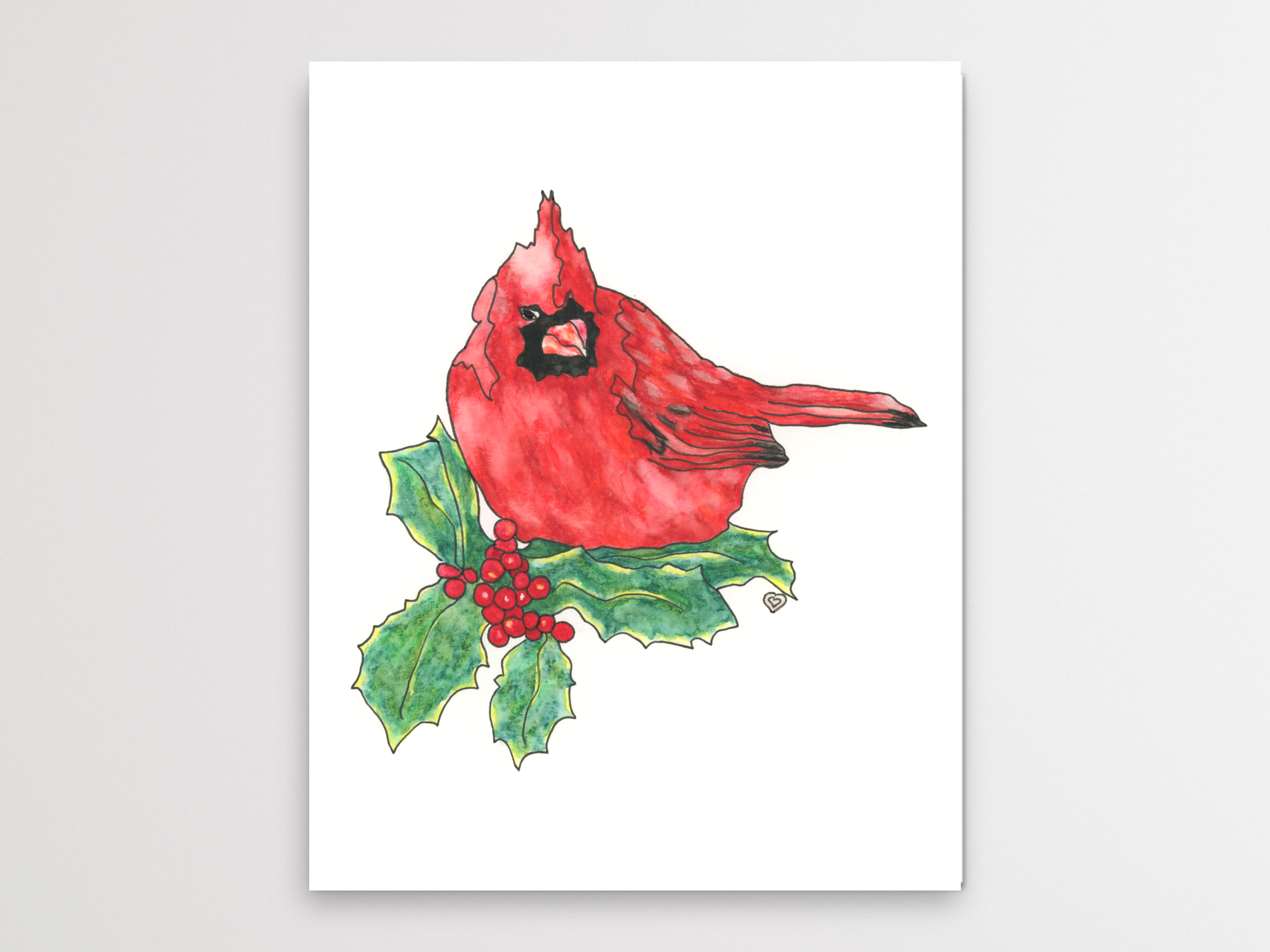 Cardinal Watercolor and Ink art print for your home, living room, den, study, kitchen, dining room, nursery, or office. A fine art print on archival matte paper.