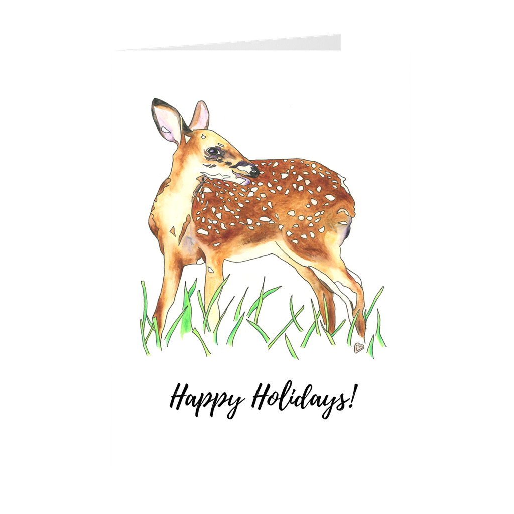 This Happy Holidays White Tailed Deer Fawn Greeting Card is blank inside ready to be inscribed and sent to your loved one. Images show front and back of the card. This high quality 5 x 7 paper card comes pre-folded, with a white envelope. Works well with regular ballpoint pens after a short drying time. Card is folded intentionally offset to allow a slight overhang so the cards can be easily opened.Current production time: Estimated production time approx. 6 days. Shipped USPS First Class PKG with tracking.Comes packed in cello sleeve and flat mailer.For personal use only. For commercial or licensing inquiries please contact me. Image inspiration attribution: White Tailed Deer: State Game Animal, "White tail deer - Yorktown Virginia" by watts_photos is licensed under CC BY 2.0