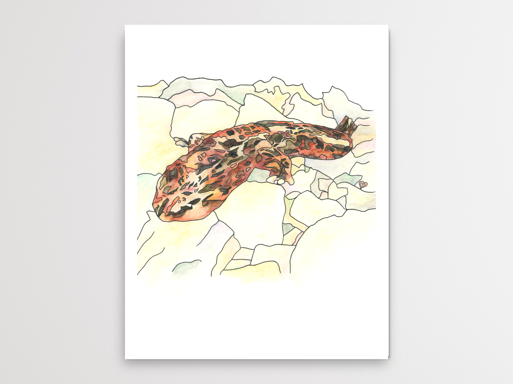 Hellbender 1 Watercolor and Ink art print for your home, living room, den, study, kitchen, dining room, nursery, or office. A fine art print on archival matte paper.
