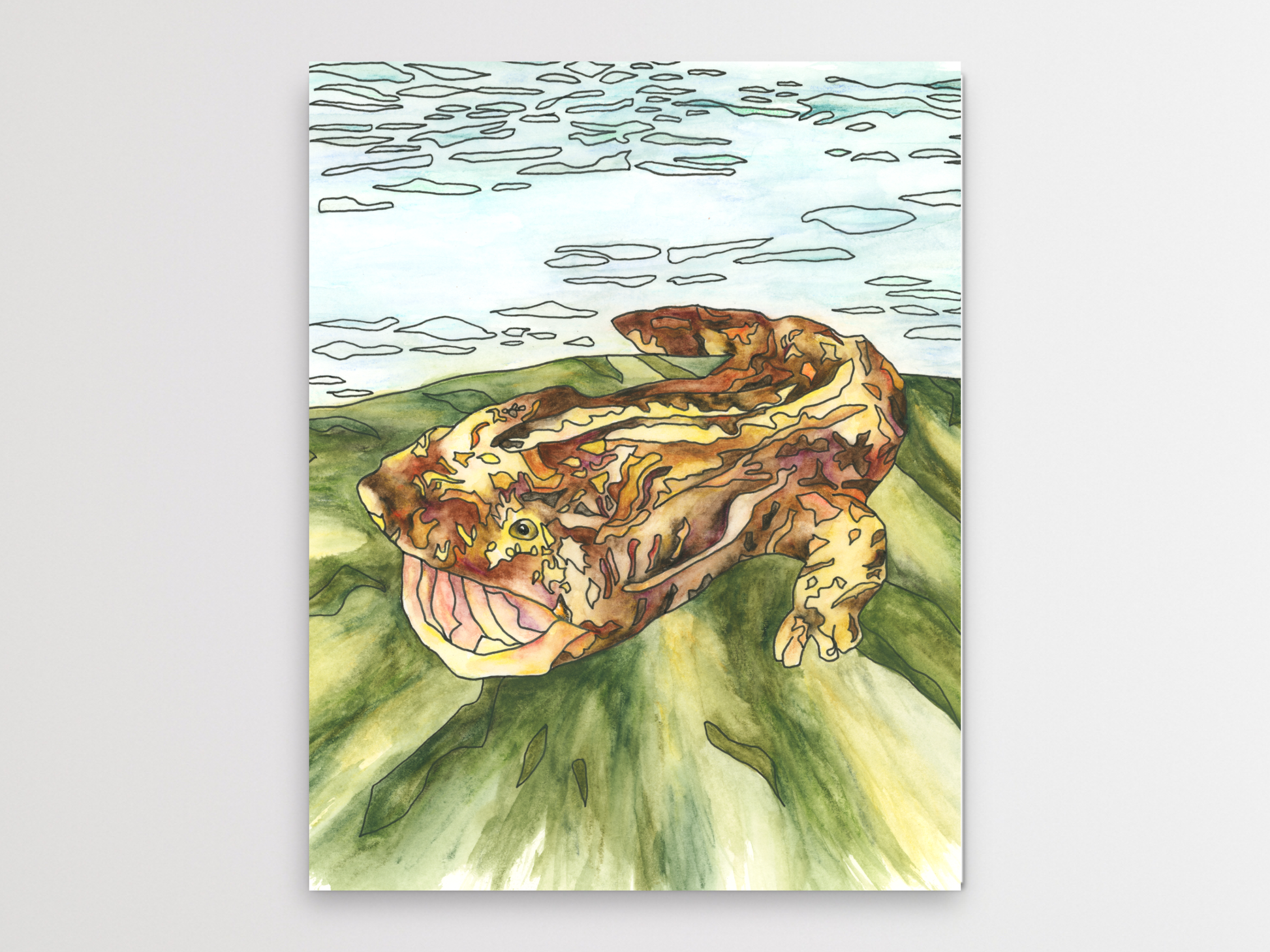 Hellbender 2 Watercolor and Ink art print for your home, living room, den, study, kitchen, dining room, nursery, or office. A fine art print on archival matte paper.