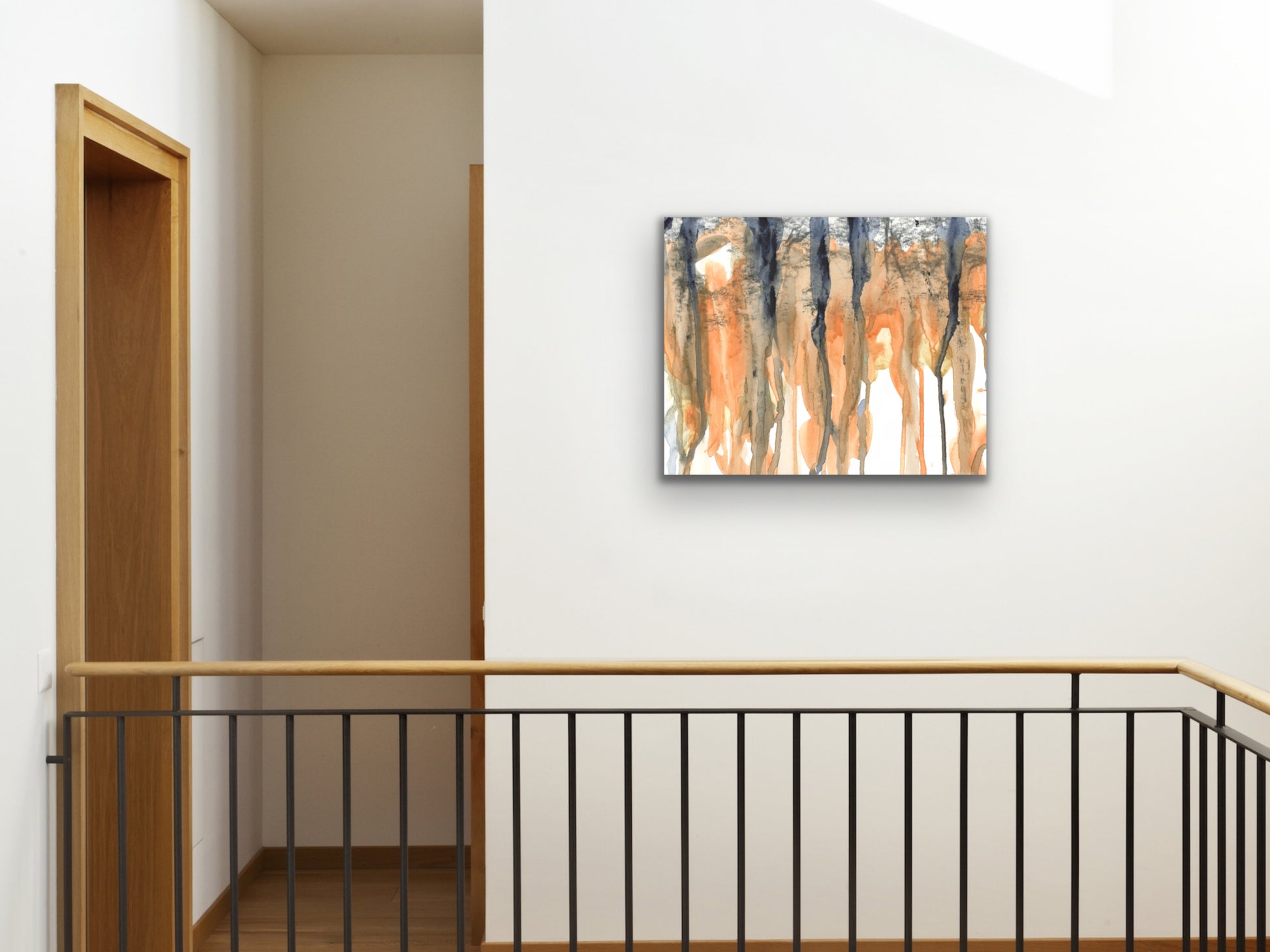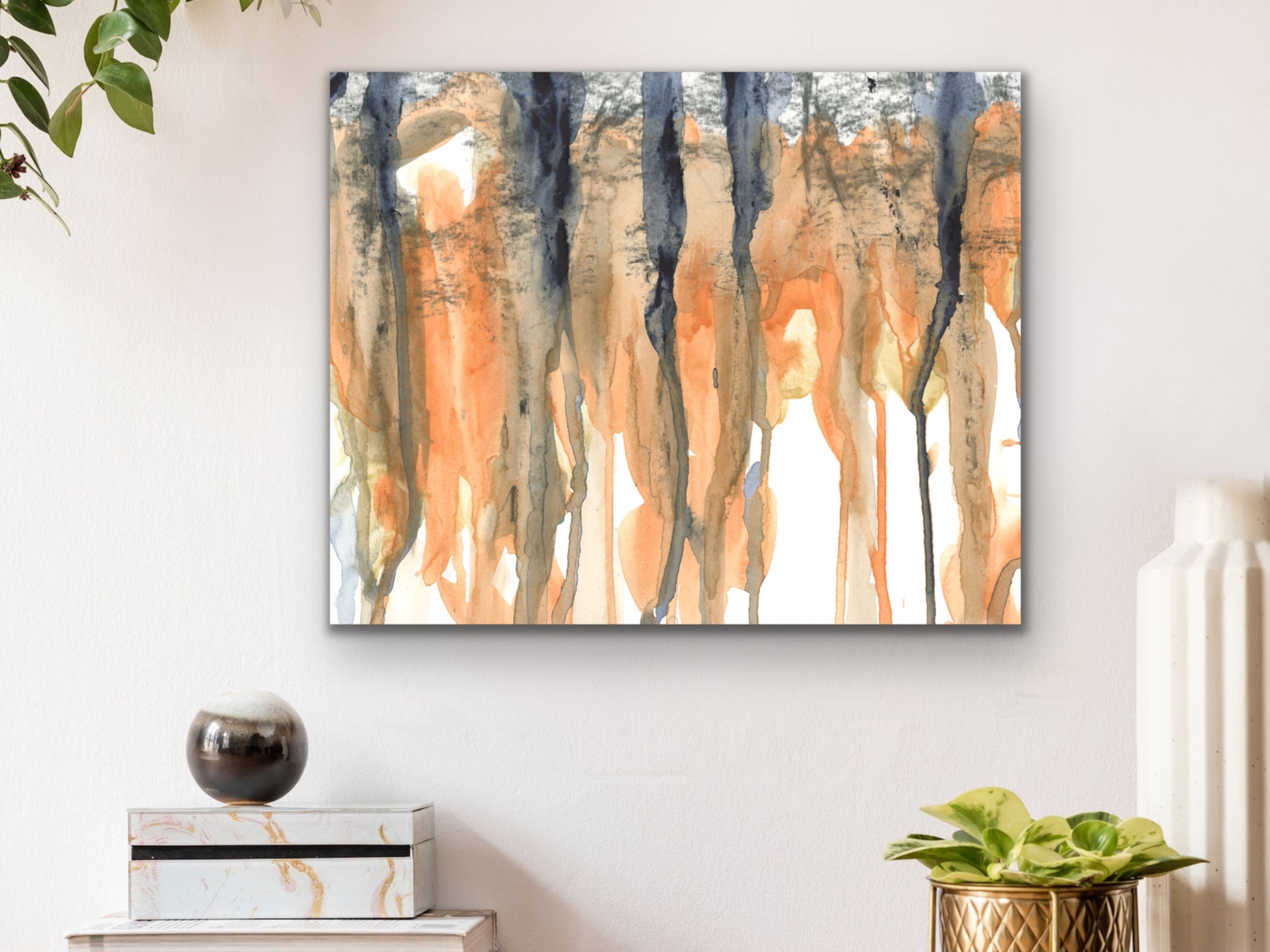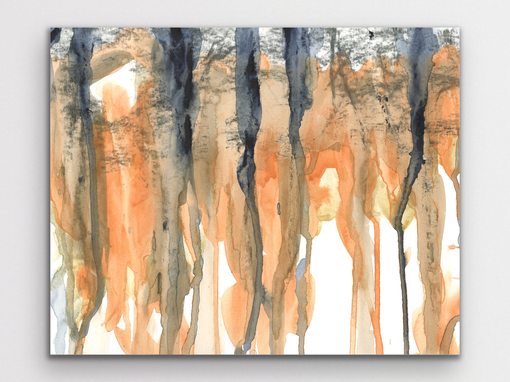 Orange and blue cascade abstract watercolor, charcoal and mica art print for your home, living room, den, study, kitchen, dining room, nursery, or office. A fine art print on archival matte paper.