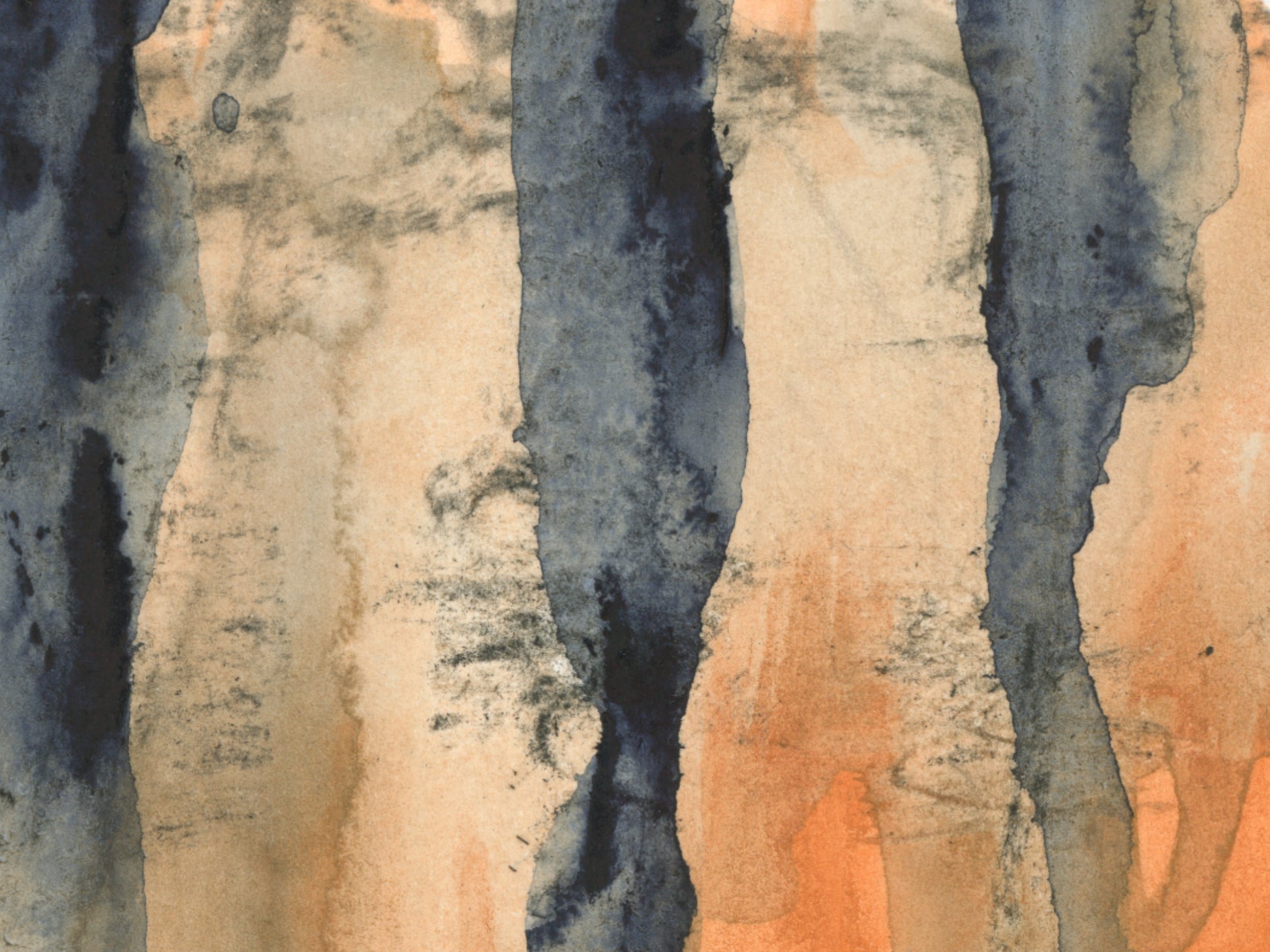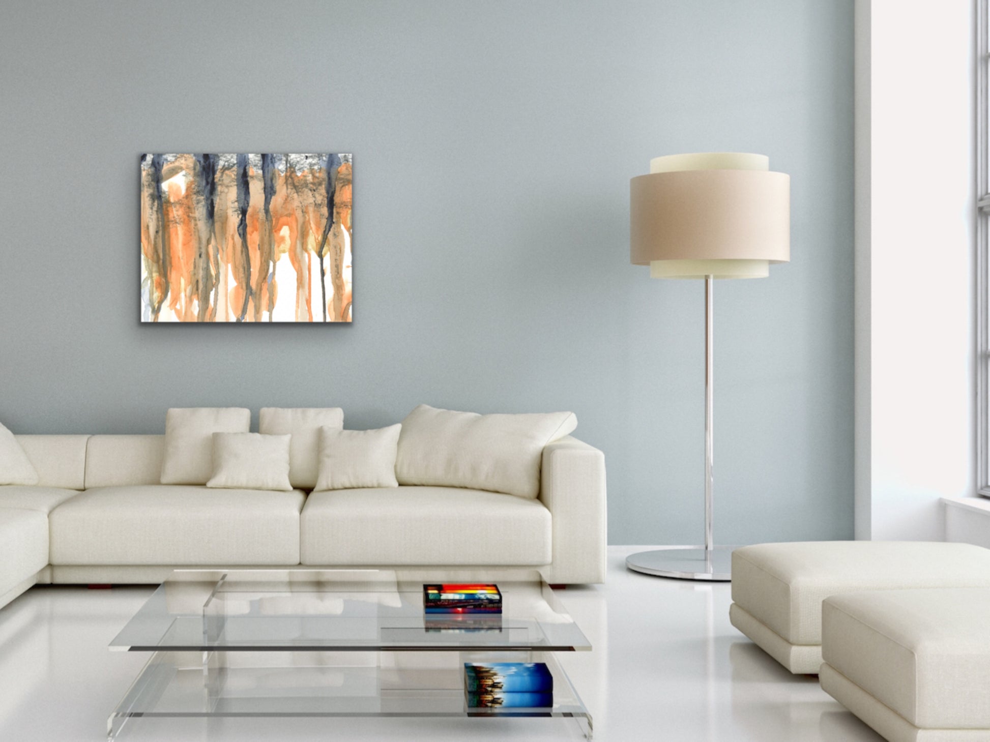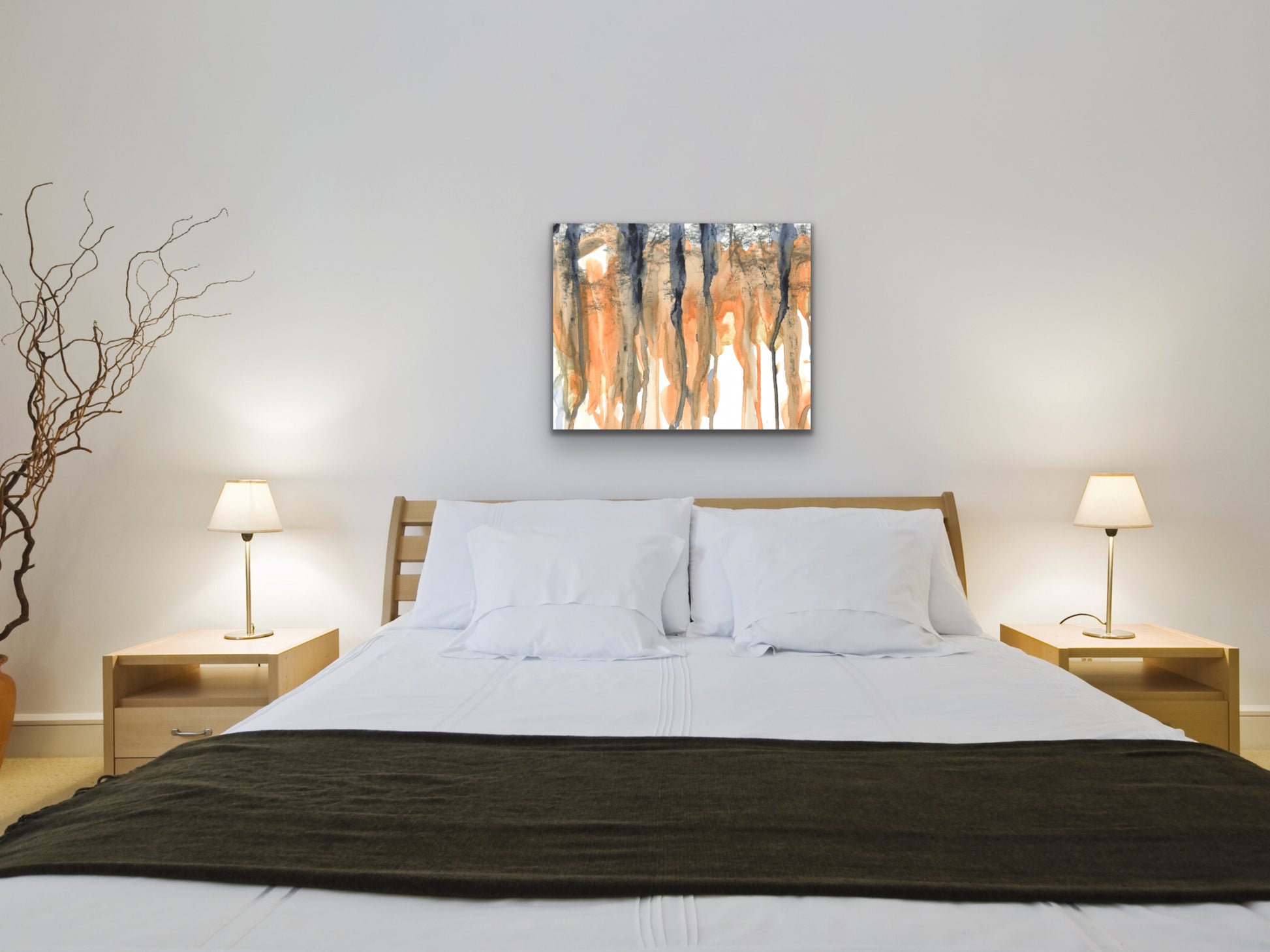 Orange and blue cascade abstract watercolor, charcoal and mica art print for your home, living room, den, study, kitchen, dining room, nursery, or office. A fine art print on archival matte paper.