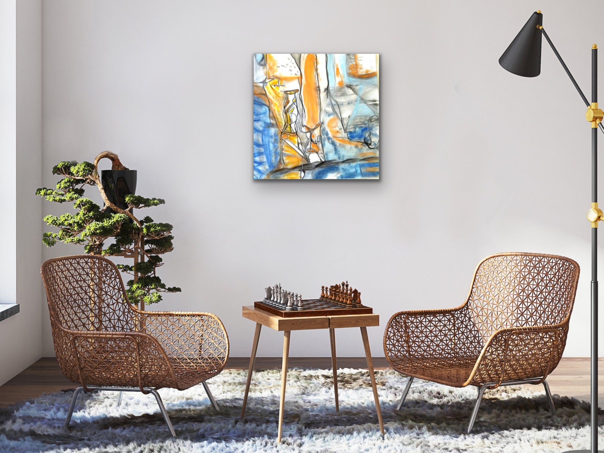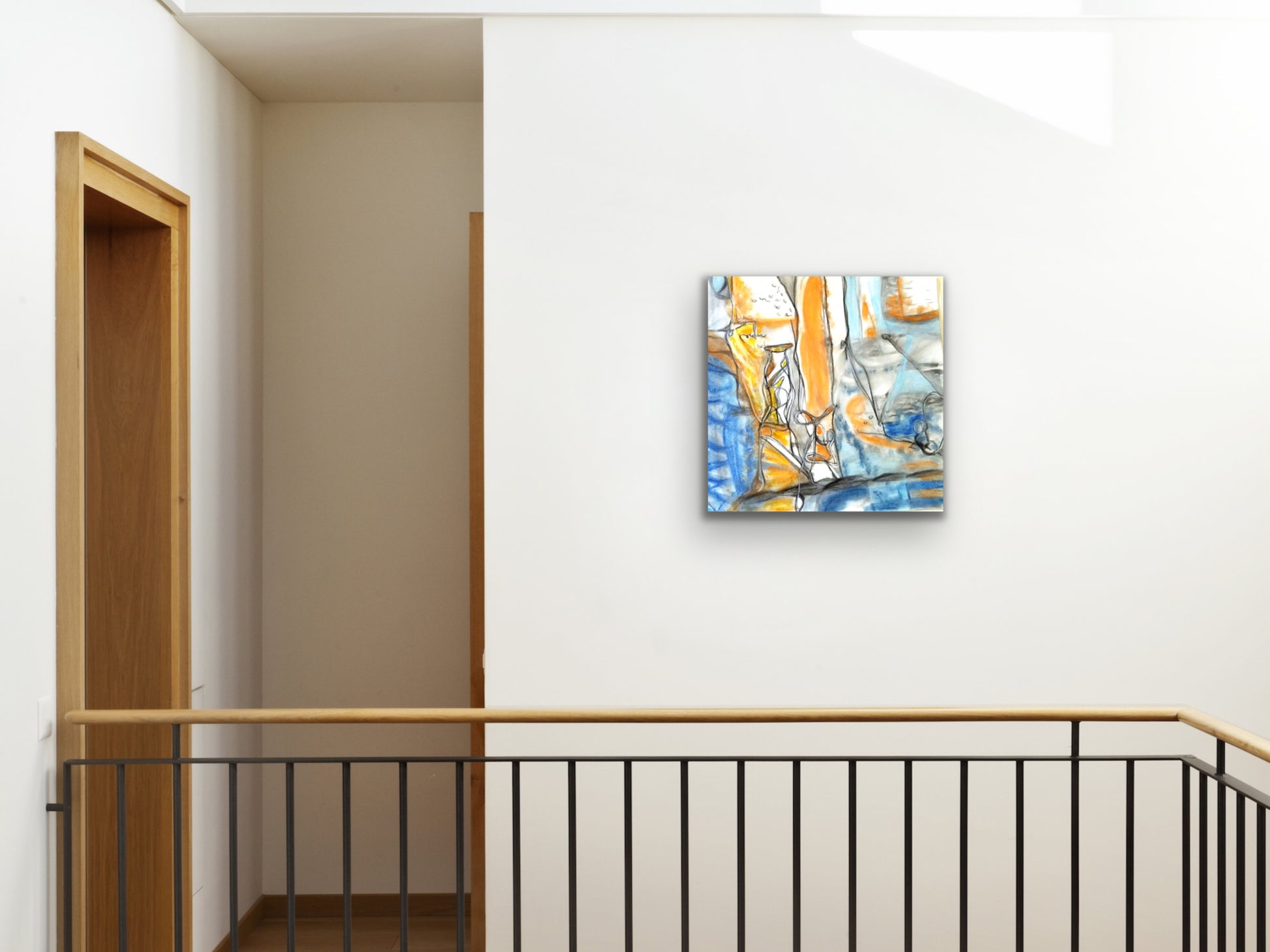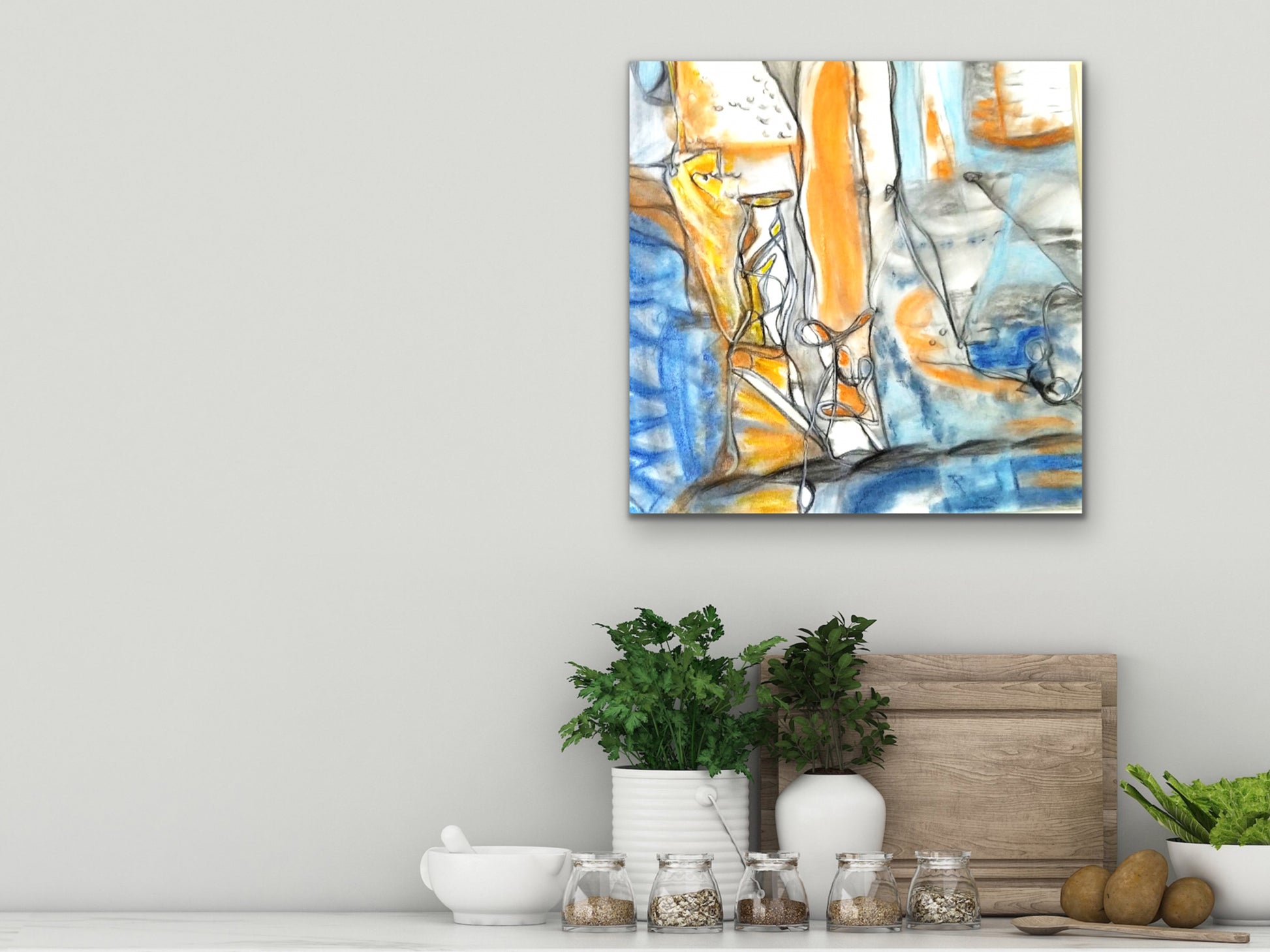 An orange and blue charcoal and pastel art print for your home, kitchen, dining room, study, den, living rom, office, kid's room, or nursery. A fine art print on archival matte paper.