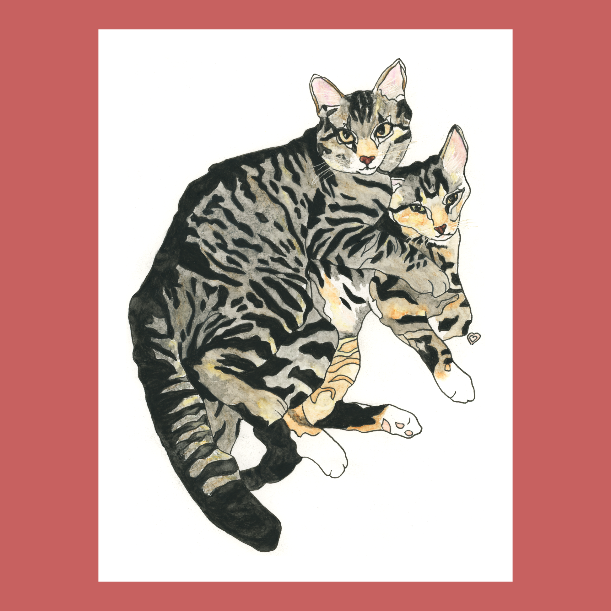 Double the fun! This portrait includes two pets. A custom portrait of two of your pets, favorite creatures, or stuffed animals in the same portrait. All creatures welcome here!