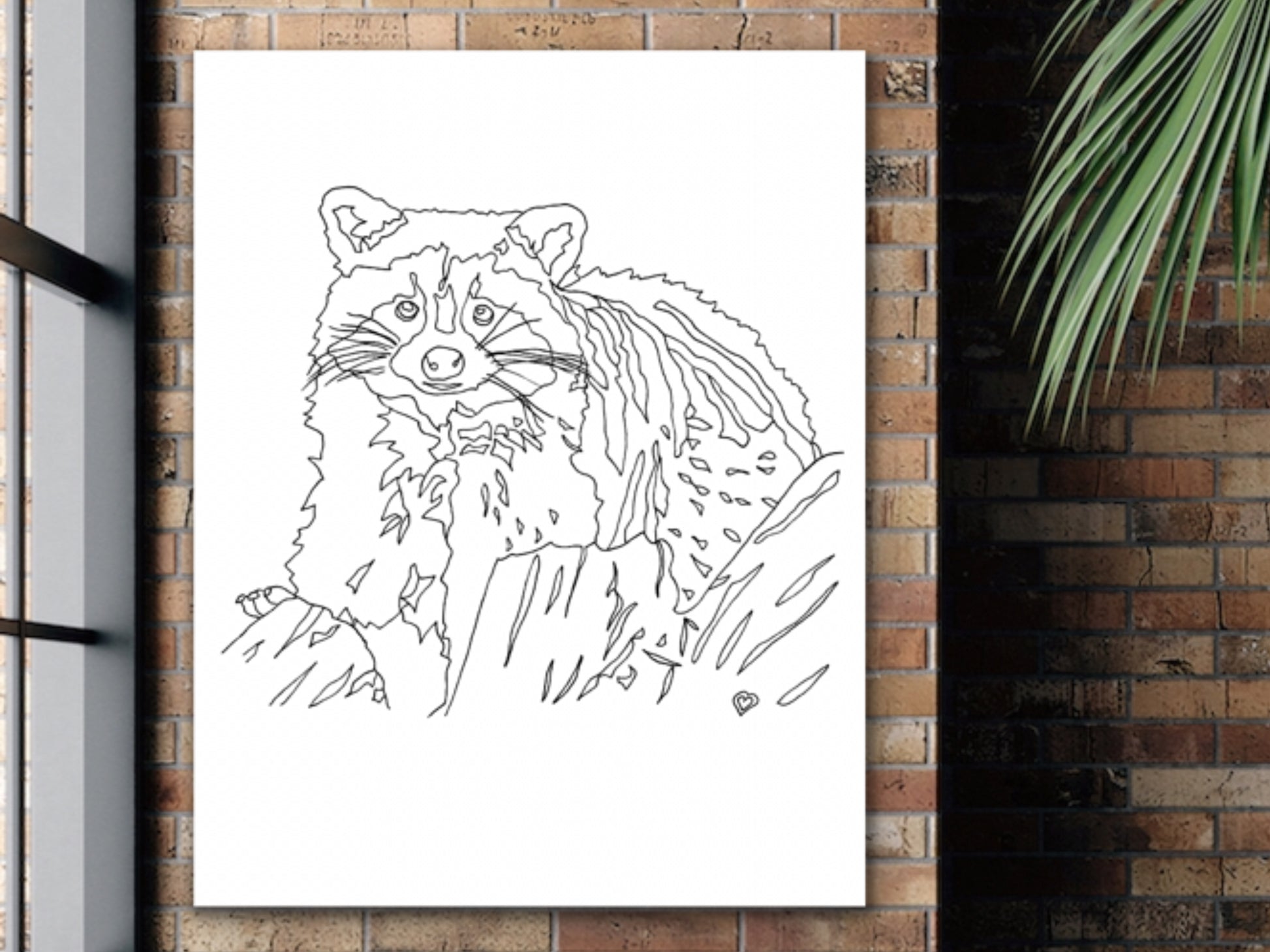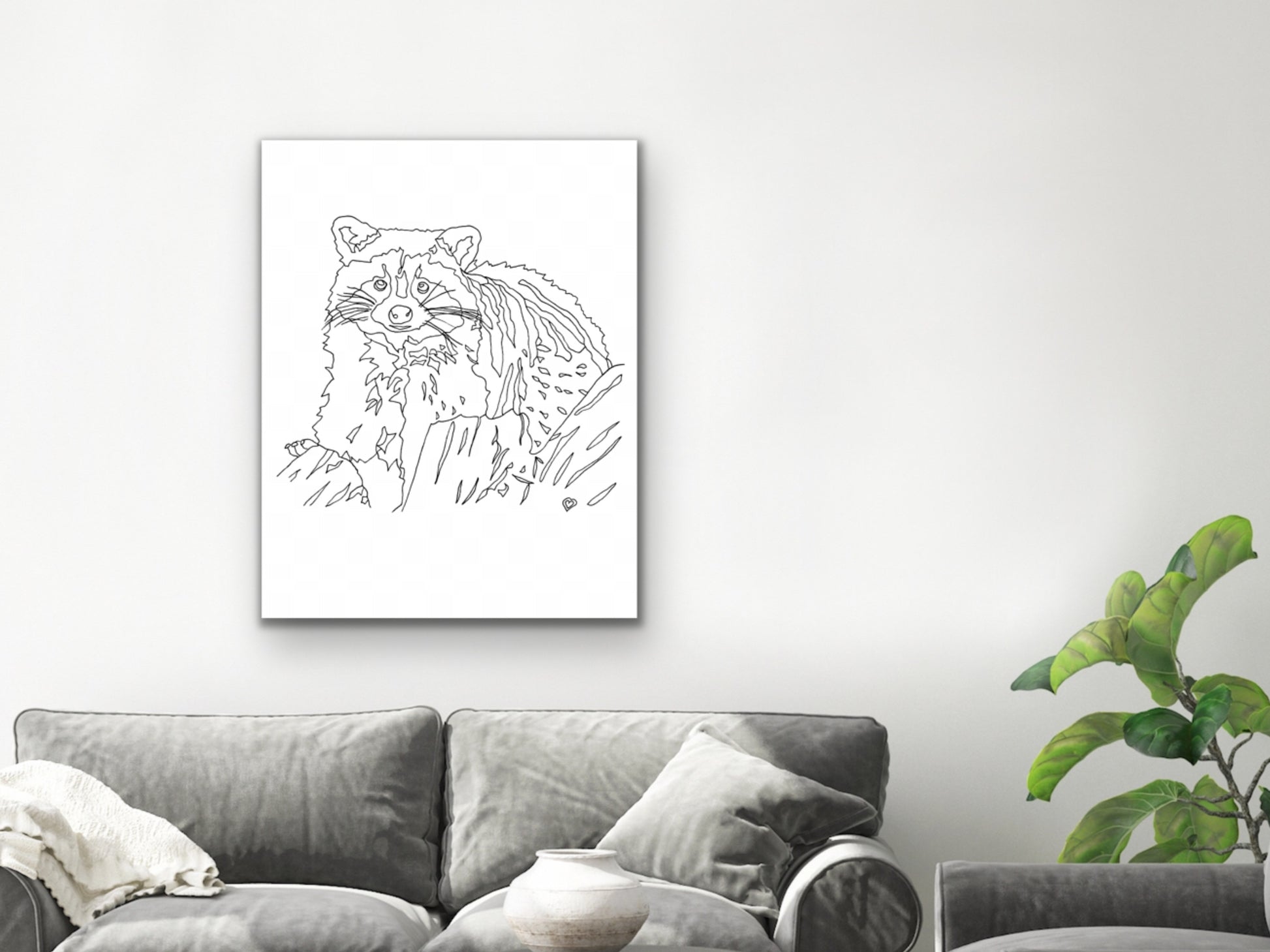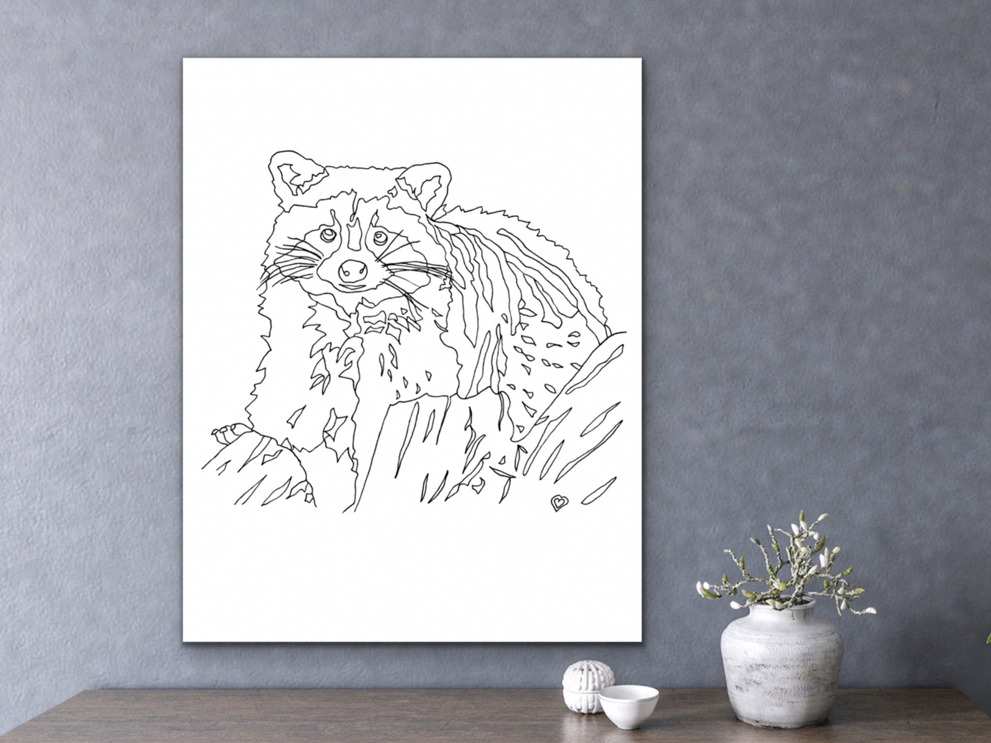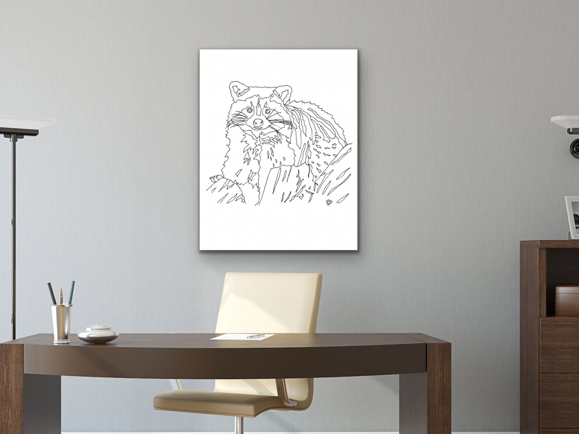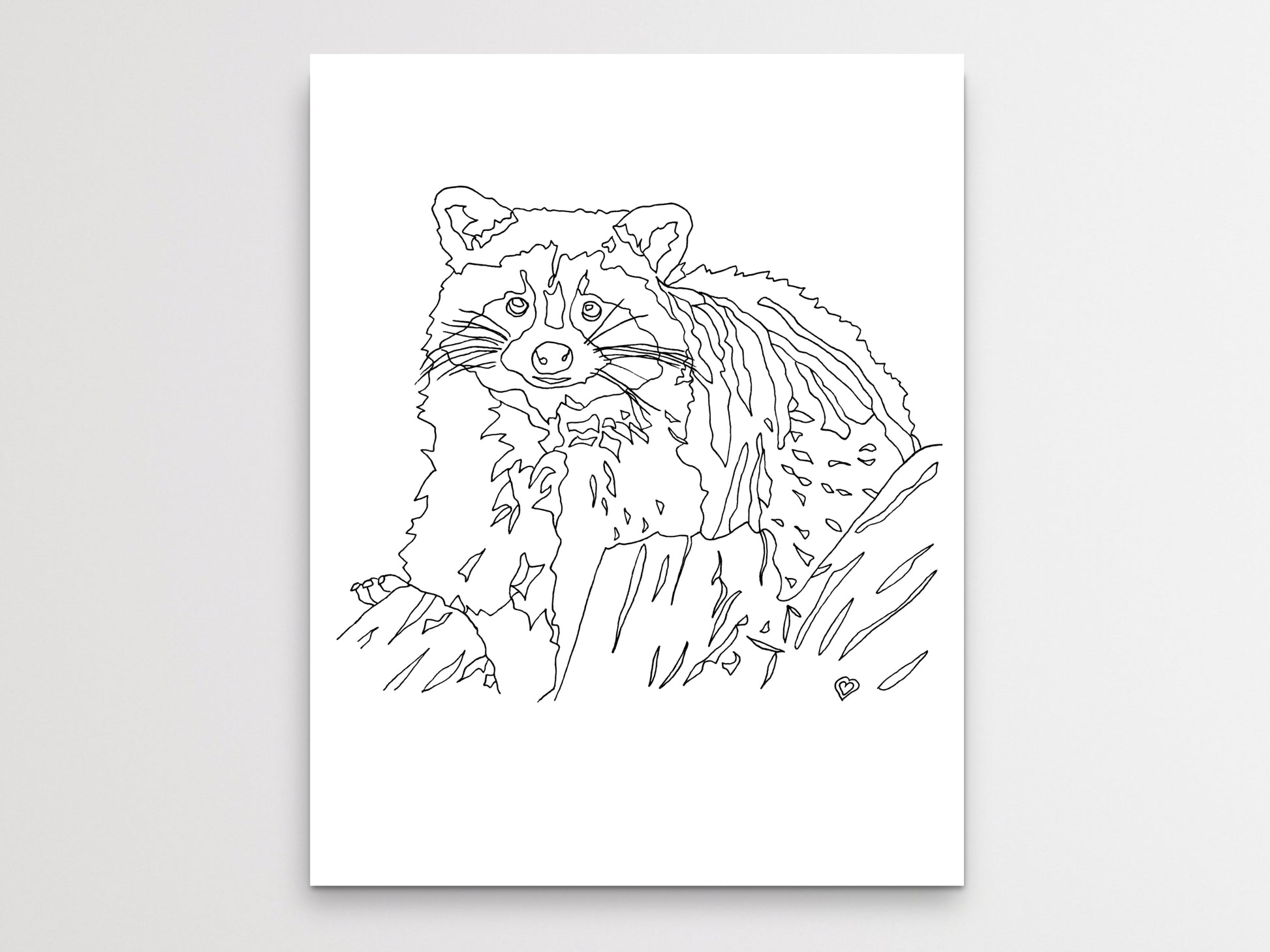 Raccoon Wall Art. An ink line art art print of a Raccoon for your home, kitchen, dining room, study, den, living rom, office, kid's room, or nursery. A fine art print on archival matte paper.