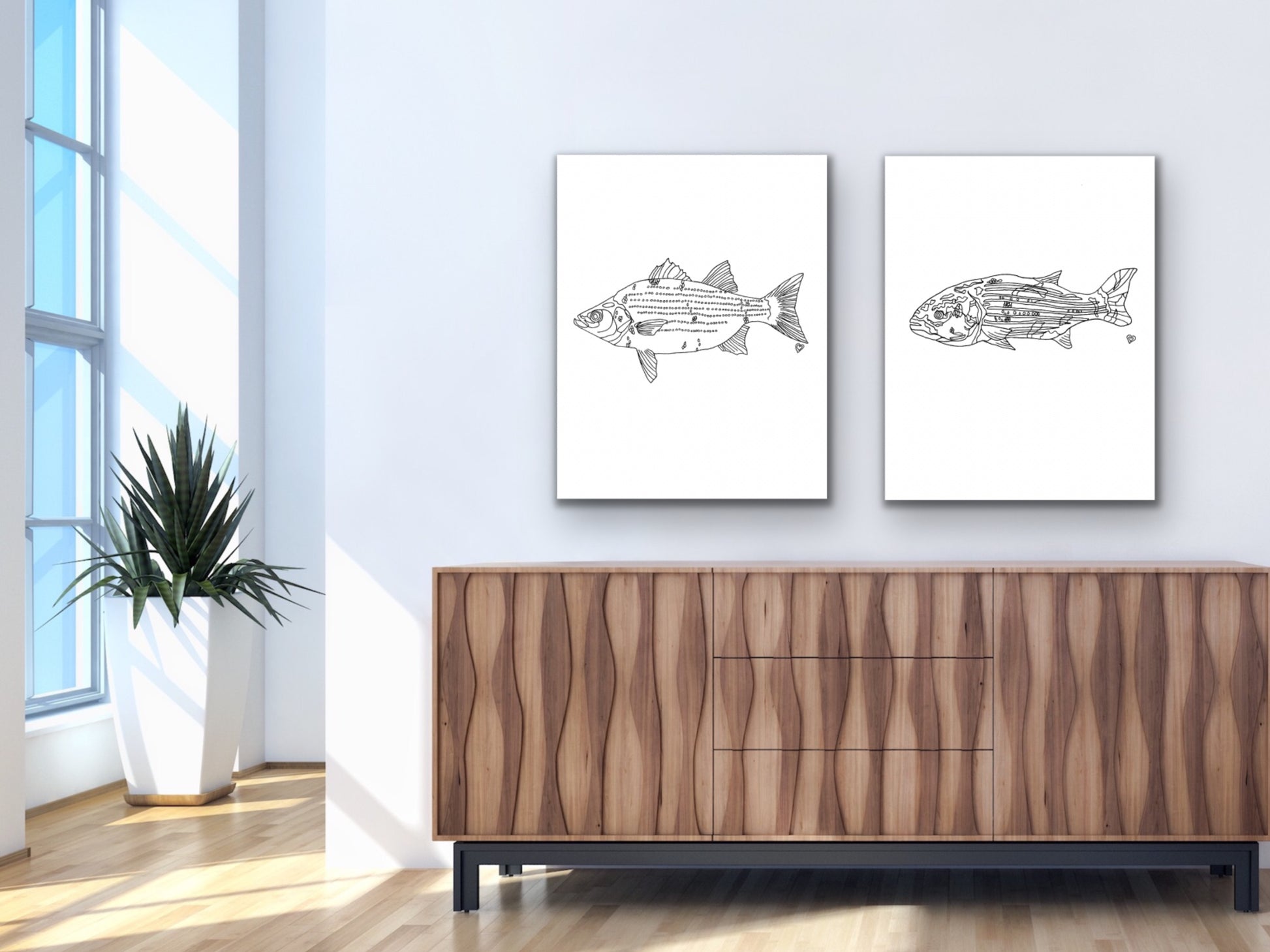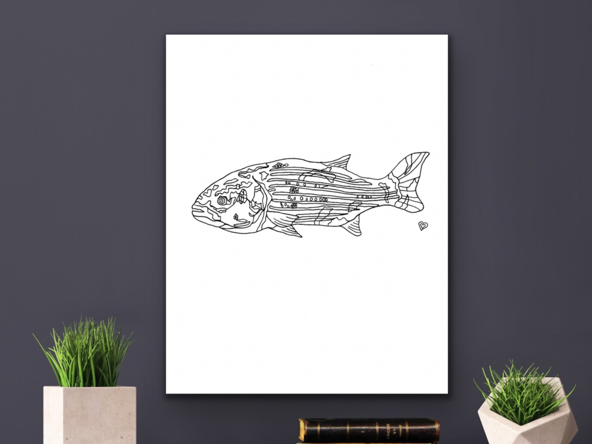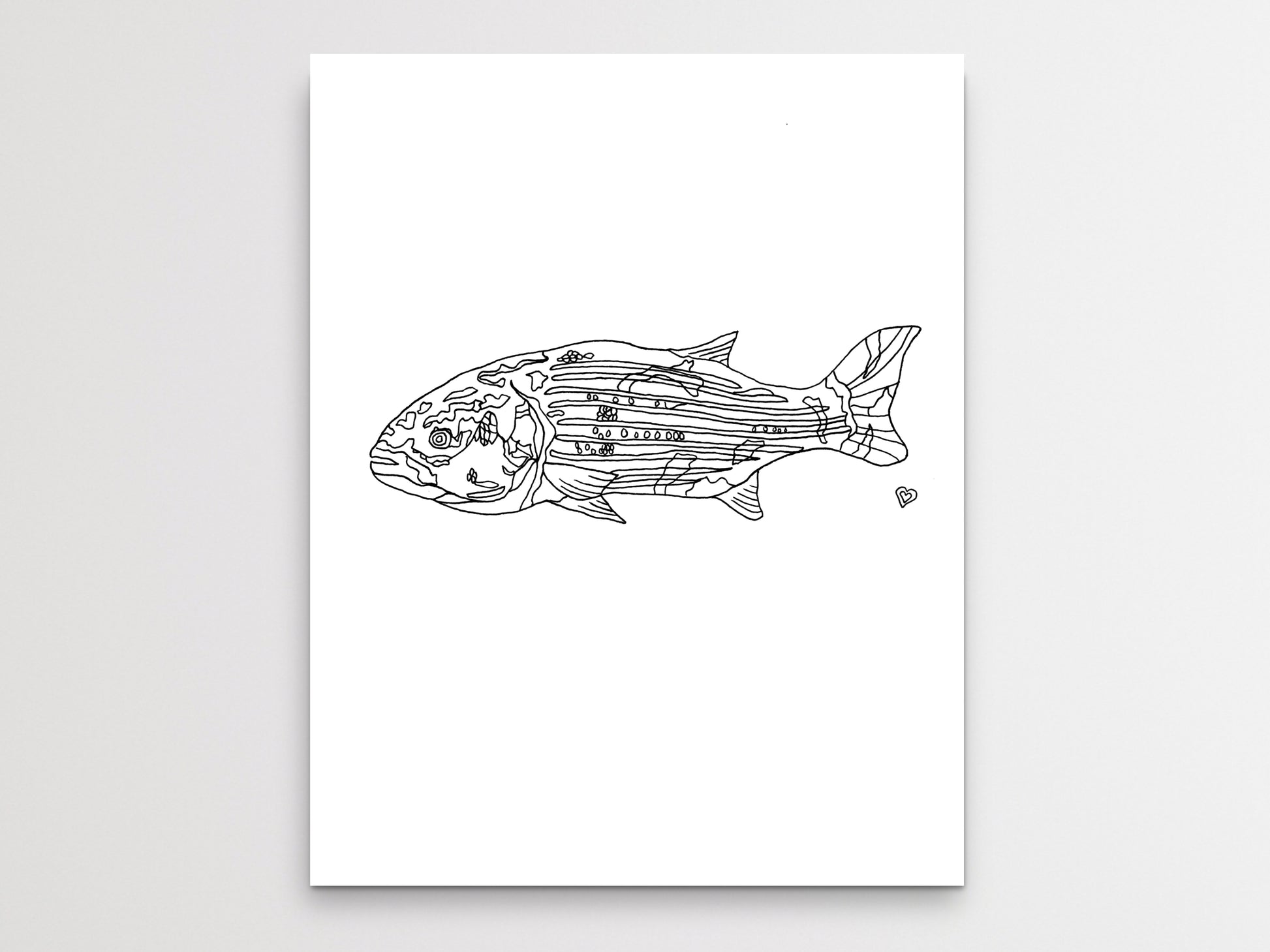 Maryland Rockfish Art. An ink art print of a Rockfish Fish for your home, kitchen, dining room, study, den, living rom, office, kid's room, or nursery. A fine art print on archival matte paper.
