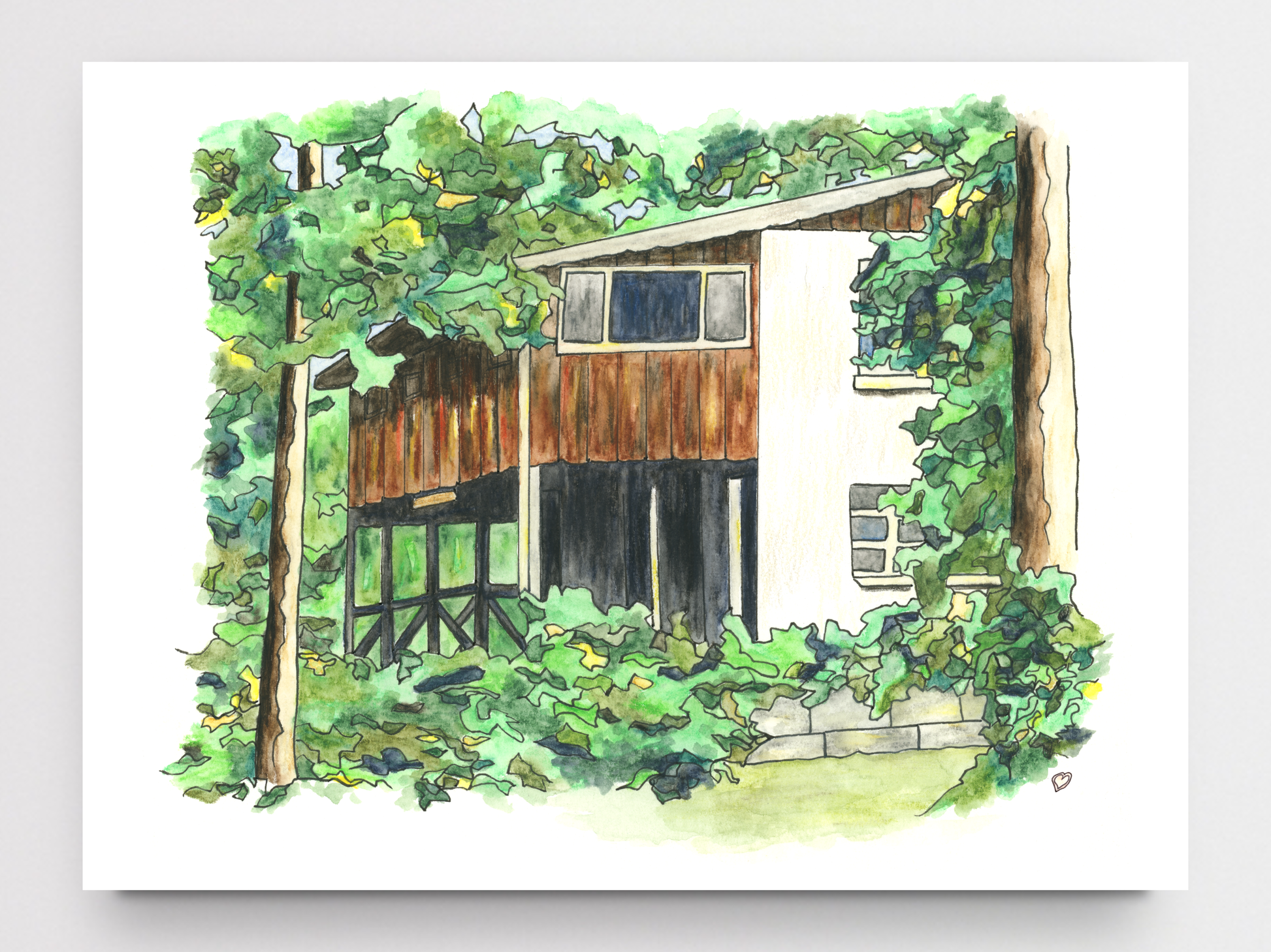 Lake Cabin Art Print By Phylinda Moore. Available in Multiple Sizes: