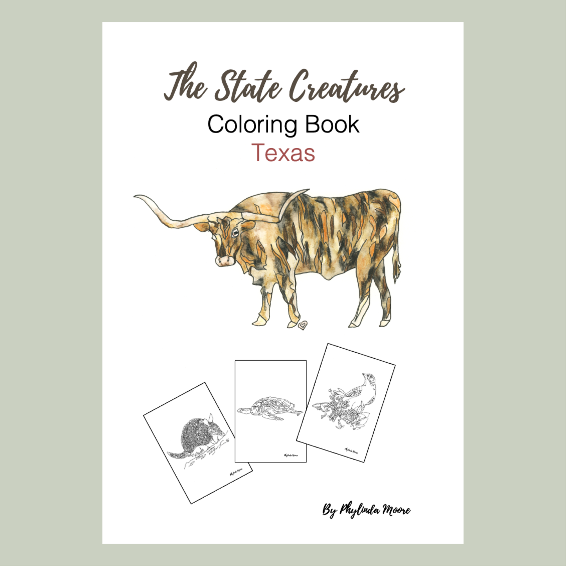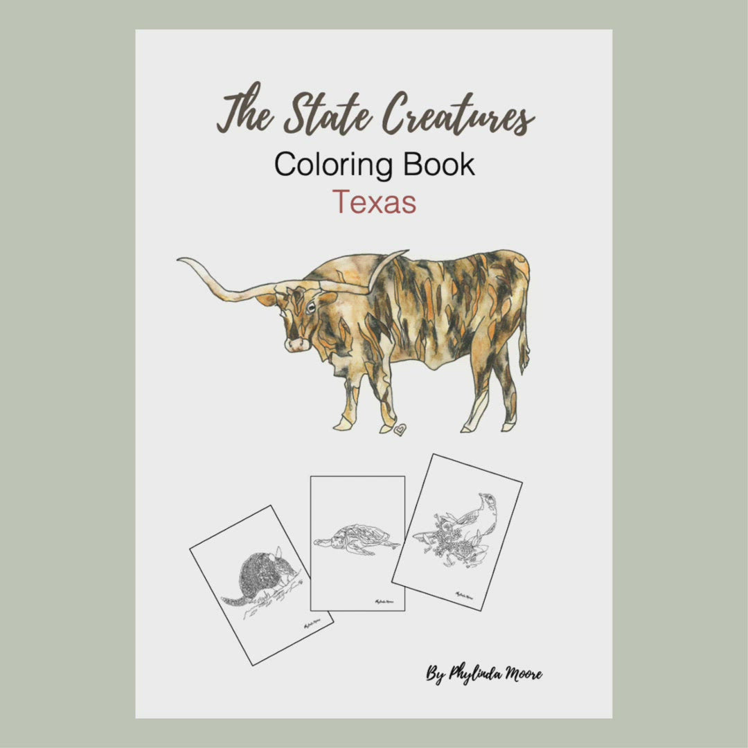 12 state creatures of Texas make up this lovingly created coloring book. Learn, color, and enjoy! By artist Phylinda